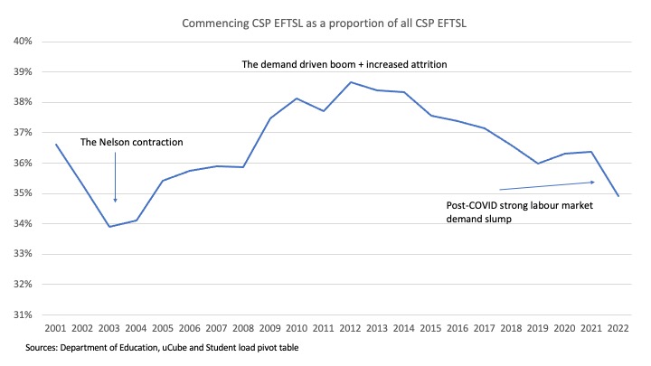 This is what universities did back in the Nelson era. Reading the policy direction, universities reduced their commencing intakes to bring total CSP EFTSL down to allocated levels. As the chart below shows, commencing CSP EFTSL as a share of all CSP EFTSL fell to its lowest point this century.