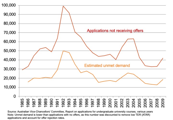Unsurprisingly unmet demand (as calculated by the AVCC, UA’s predecessor) went up, as seen in the chart below. The commencing student cutback can also be seen in a drop in the age 19 participation rate.