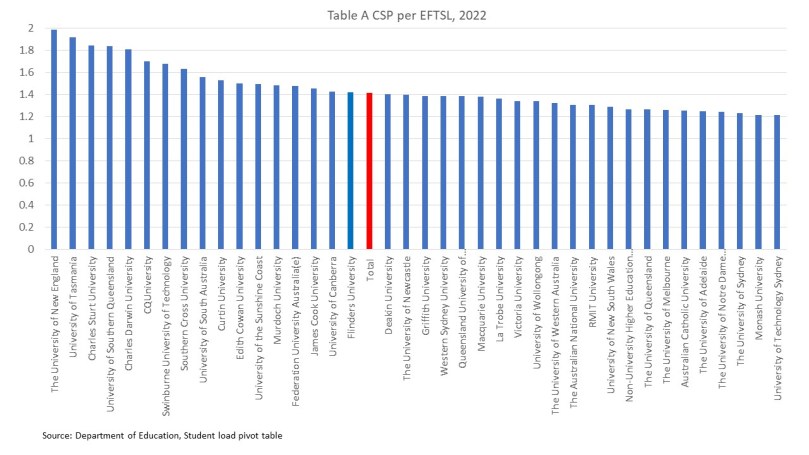 One idea proposed last year that I thought had merit was needs funding based on headcount rather than EFTSL. Especially for non-academic matters, support needs are likely to be more closely linked to the number of people than the number of subjects. As the chart below shows, students per EFTSL vary widely from primarily on-campus universities in the 1.2 to 1.3 range to nearly 2 students per EFTSL at UNE.