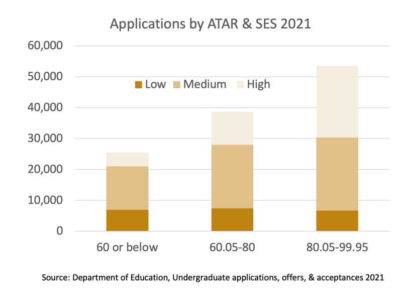 As most Australian students enrol in a university within commuting distance of their home, this means that universities in catchment areas corresponding to SES SA1s above the lowest quartile would take students with high needs but get no additional support. As the chart below shows, defining low ATAR as 60 or below, most potential students with above-average academic needs are not classified as ‘low SES’.