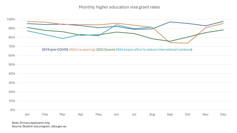 The previous government’s early 2022 decision to lift restrictions on student work hours, which were not re-imposed until mid-2023, attracted students who wanted to work rather than study. Home Affairs realised what was going on and visa grant rates went down, as seen in the chart below (other than the late 2022 approve-almost-anyone backlog clearing; see the very high processing numbers in the first chart).