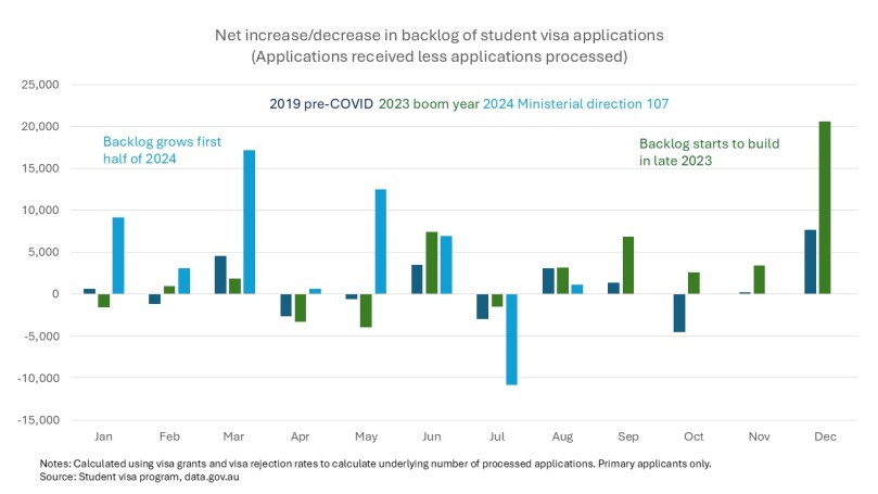 In the second half of 2023, shown in green in the chart below, monthly visa processing dropped back to levels that were similar to 2019. Ministerial direction 107 was announced in December 2023, but that was the fourth month of more normal pre-COVID visa processing volumes.