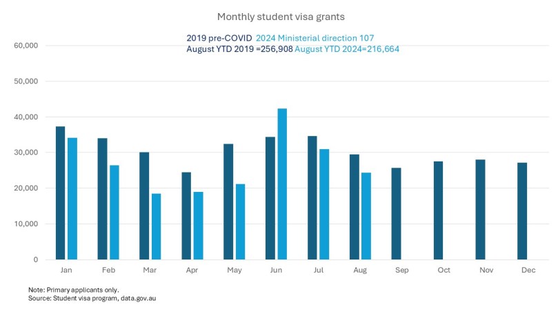 As the chart below shows, the interaction of fewer applications being processed and a lower approval rate is that, in August year-to-date terms, 40,000 fewer visas have been granted in 2024 compared to 2019, or a 15% decline.