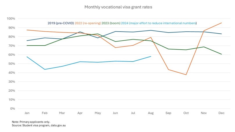 Low vocational education grant rates have nothing to do with ministerial direction 107. These are due to mix of bad incentives attracting non-genuine students, tougher (and sometimes inconsistent) application of the rules, and new rules. Increased financial requirements in October 2023 and May 2024 might have had an impact here. The new genuine student test and increased English language requirements took effect in March 2024, although most of the visa processing in the chart below was under the old rules (the change applied to new applicants).