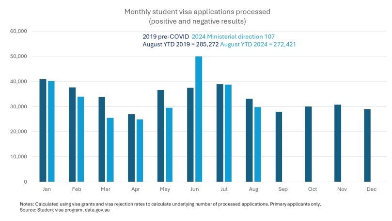 Removing 2022 and 2023 to make the chart easier to read, we can see that in 2024 visa processing was below 2019 levels except for a surge in June. That surge meant that visa processing is, in year-to-date to August terms, down by less than the other months might suggest compared to 2019 – 13,000 or 4.6% fewer applications processed.