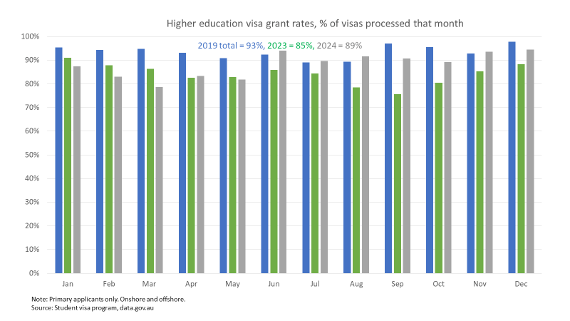 Although processing levels are a significant driver of higher education visa grants, from January to May 2024 visa grant rates were below previous levels. But from June 2024 grant rates improve – still generally below 2019 levels but above those recorded in 2023.