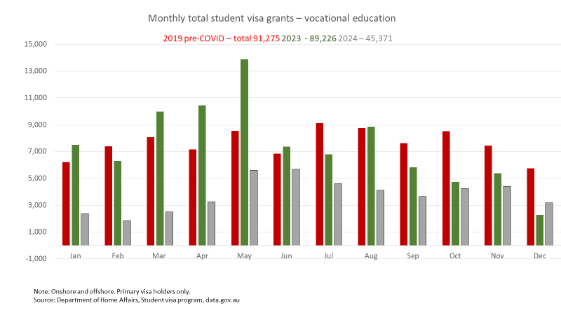 As expected given the decline in visa applications, vocational visa grants are well down on 2019 or 2023. The reduction is about 50%. Vocational visa grants in 2024 of 45,371 are less than half the indicative cap for 2025 commencing students.