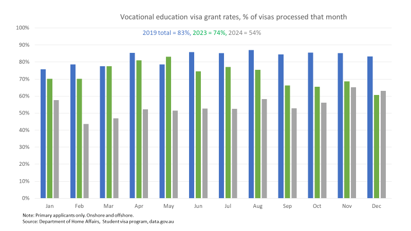Weak vocational education demand has been exacerbated by low visa grant rates, only 54% for 2024, although with some improvement in November and December, possibly for the same reasons I suggested for higher education. Longer processing times for vocational compared to higher education could mean that it took longer for higher-quality applications to influence grant rates.