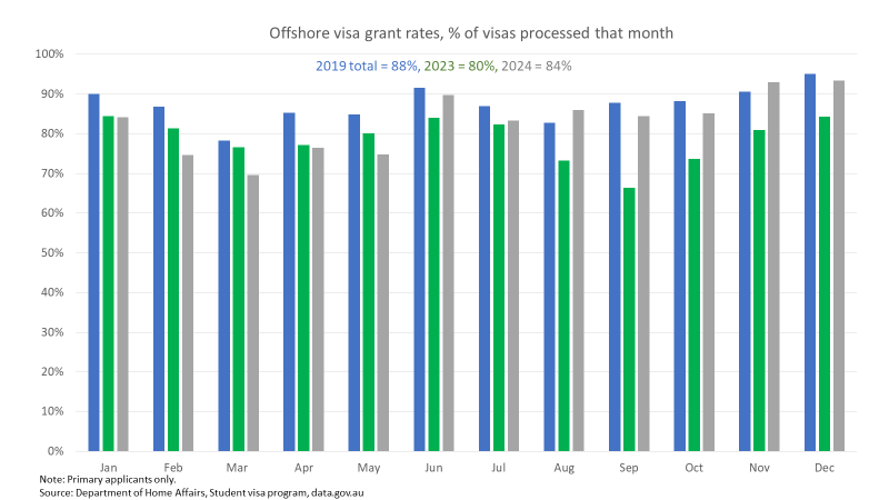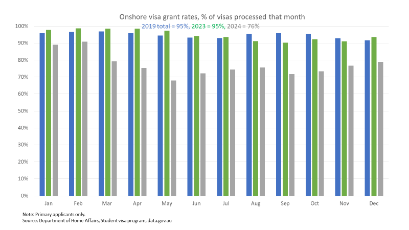 Onshore application visa processing increased in the second half of 2024 but the grant rate remains well down on the past.