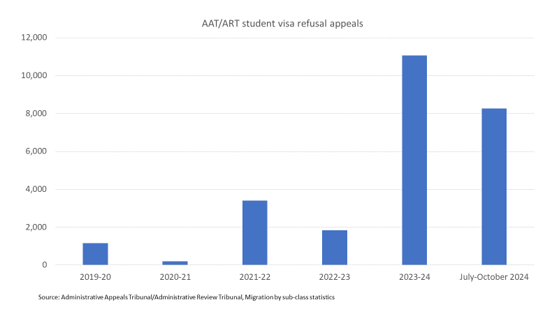 As of 13 October 2024, 18,227 student visa refusal cases were yet to be resolved. Of the 920 resolved cases in the July to October 2024 period, in just under half the tribunal set aside the original decision. If that apppeal success rate continues – it is above than the historical average – this will drive up onshore visa grants.