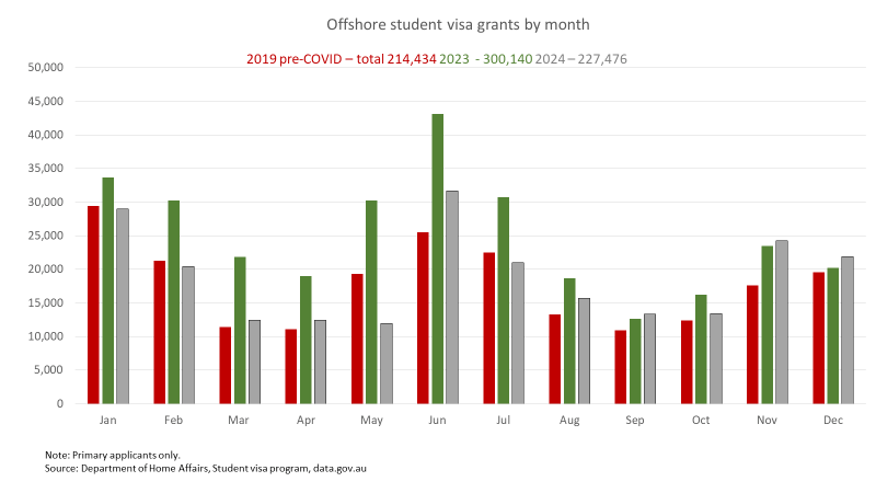 Offshore student visa grants in 2024 were down 24% on 2023. The government may be concerned that 2024 grants are up 6% on 2019 and exceeded 2019 levels in every month from August to December 2024. For higher education 2024 visa grants were 29% above 2019 levels.
