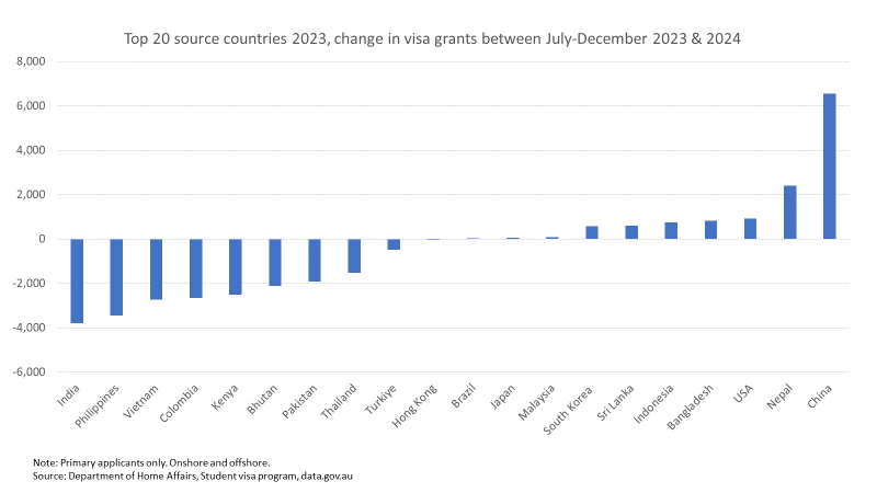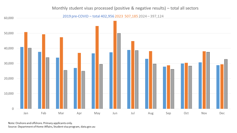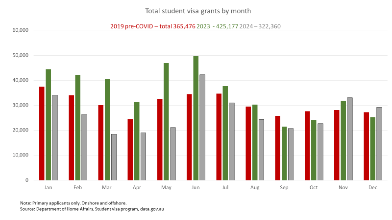 A late 2024 boost in processing explains why more visas were granted in November and December 2024 than in either the 2023 boom year or pre-COVID year in 2019 (chart below). But for the whole 2024 calendar year, visas granted are down 24% on 2023 and 12% on 2019. This includes fewer grants in student visa categories not discussed in this post, the most significant of which is for English language courses.