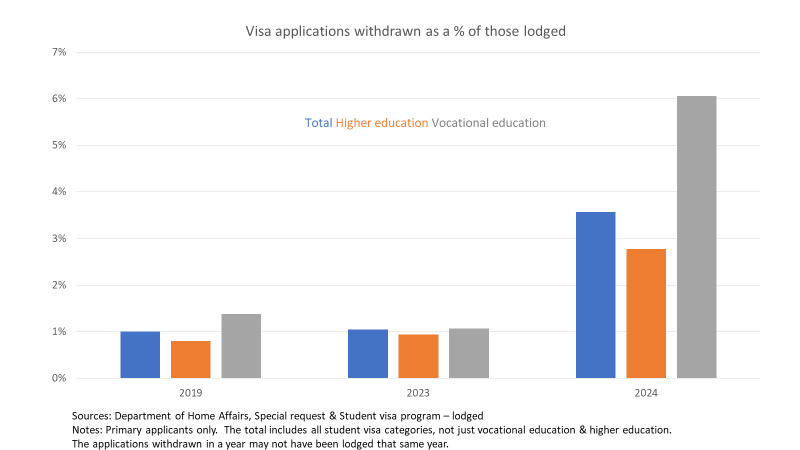 In 2023 visa grant rates fell significantly, especially for vocational education but also for higher education. Applications that would once have been successful were being rejected. That altered incentives for both students and education providers.