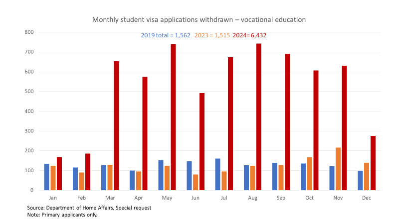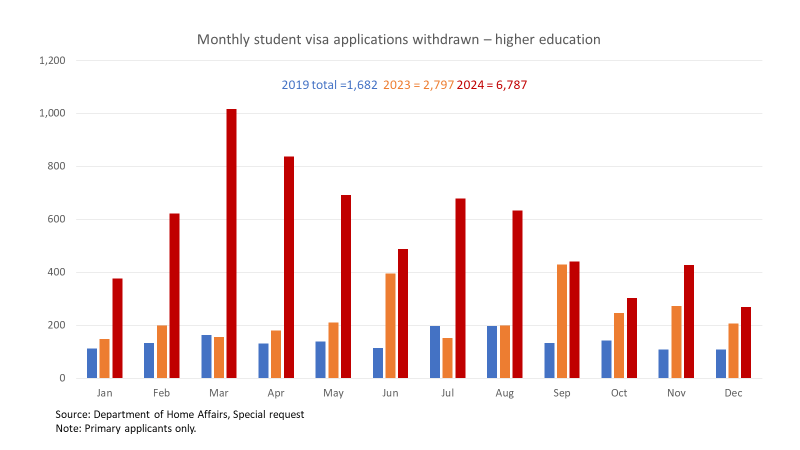 By late 2024 monthly visa applications withdrawn were well down on earlier in the year. Fewer applications were being made, possibly reflecting less interest in Australian higher education but also agents and providers more effectively filtering out weak contenders.