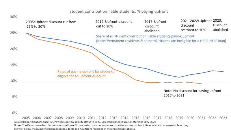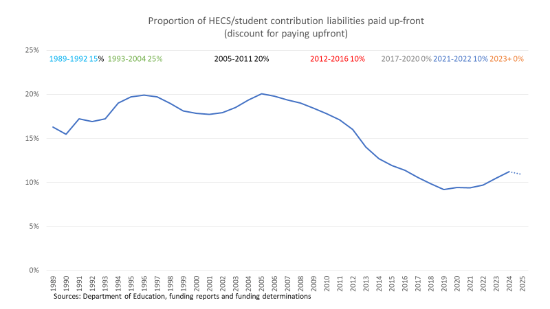 The size of the incentive to pay student contributions upfront has varied over the last 20 years. Any incentive was abolished in 2017, restored for 2021 and 2022 to get Pauline Hanson to vote for Job-ready Graduates, and then abolished again from 2023.