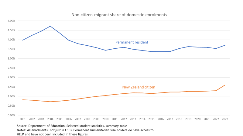 Is the general upward trend after 2019 due to more permanent resident and New Zealand students who are ineligible for a HELP loan? Unfortunately the available data does not distinguish between New Zealanders who are eligible for HELP and those who are not. Nor does it distinguish between CSP and full-fee students.