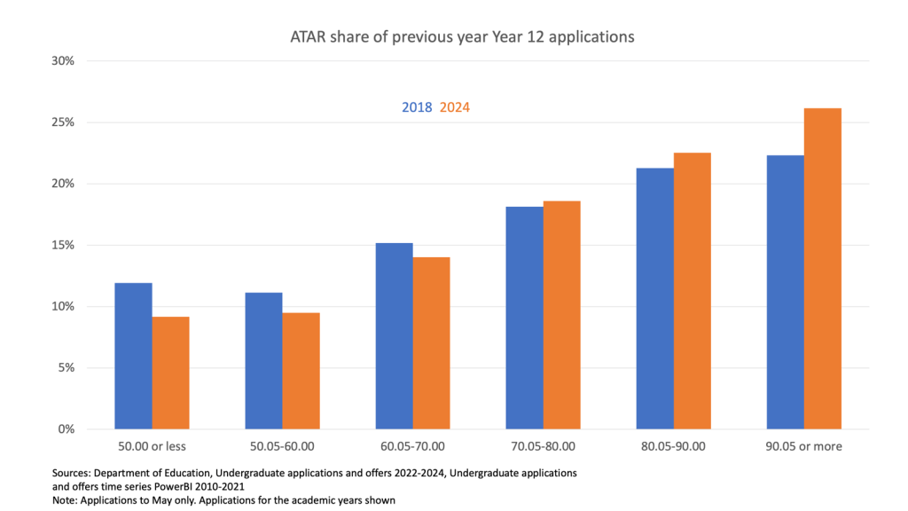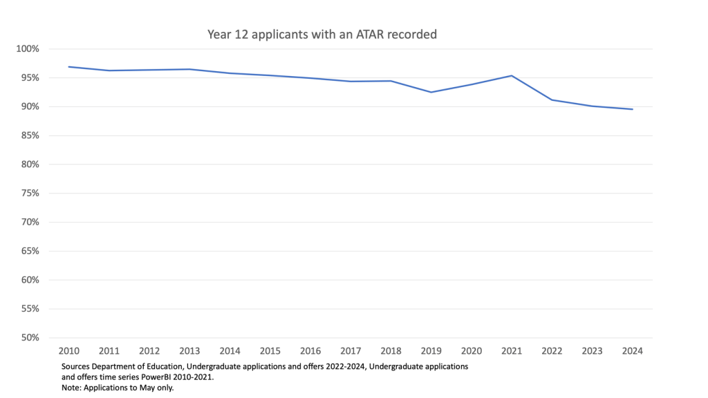 Any analysis of the ATAR profile of school leaver applicants must also be caveated. The share of applicants who completed Year 12 with an ATAR has dropped over time, to about 90%. This does not mean that ATAR was used in 90% of applications, just that the applicant had an ATAR.