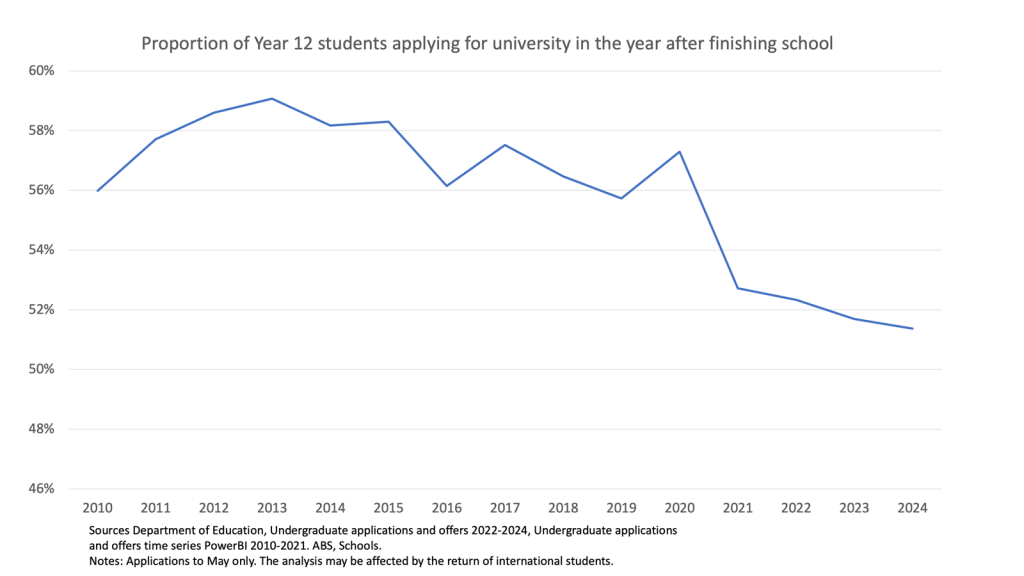 Despite the small increase in applicants for the 2024 academic year who finished Year 12 in 2023, the share of Year 12s making an application continued its decline. This is because the number of Year 12s increased by more than the number of Year 12 applicants.