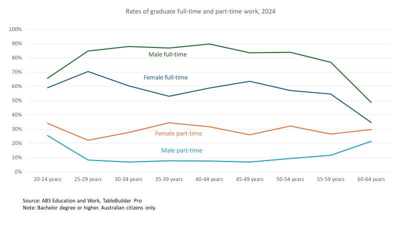 As the chart below shows, women’s full-time work rate peaks in their late 20s, dips in their 30s, then partially recovers in their 40s. Women not working at all also peaks in their 30s, at about 12% in 2024. Obviously this is the decade when women are most likely to be caring for young children.