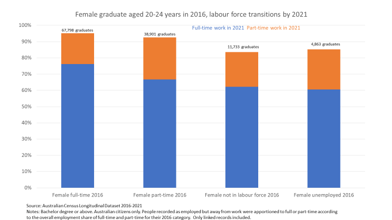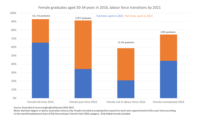 The next chart looks at the 5-year transitions for women aged 25-29 in 2016 and 30-34 in 2021. Here we can see that, unlike the younger graduates, most women who were not working full-time in 2016 were also not working full-time in 2021. However significant minorities did join the full-time workforce. Although about a third of women working full-time in 2016 had moved to part-time work or were not employed in 2021, this group has high work rates overall.