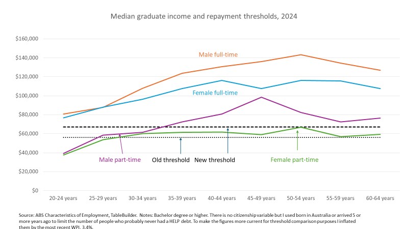 One consequence of the new first threshold of $67,000 is that most female graduates working part-time will not make any HELP repayments, as seen in the chart below. Their median income is below the threshold. This is a big change from the old repayment system, under which most female graduates working part-time made repayments. The balance between part-time and full-time work over a career is therefore more important than it was before for HELP debt balances.