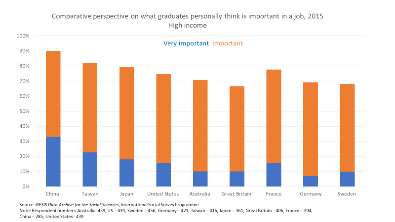 When we compare countries on the importance of high income as a job attribute then Taiwan and China are perhaps a case study in Adam Smith’s seemingly paradoxical idea that pursuing one’s own interests is not inconsistent with serving the interests of others. Graduates in these countries rate high incomes for themselves and being useful to society highly. Possibly the emphasis on income is explained by post-materialist theory, which argues that as countries get richer priorities shift towards non-material goals. China and to a lesser extent Taiwan are ‘new money’ countries in which low living standards are too fresh in cultural memory for post-materialist goals to have the influence they do in many Western countries.