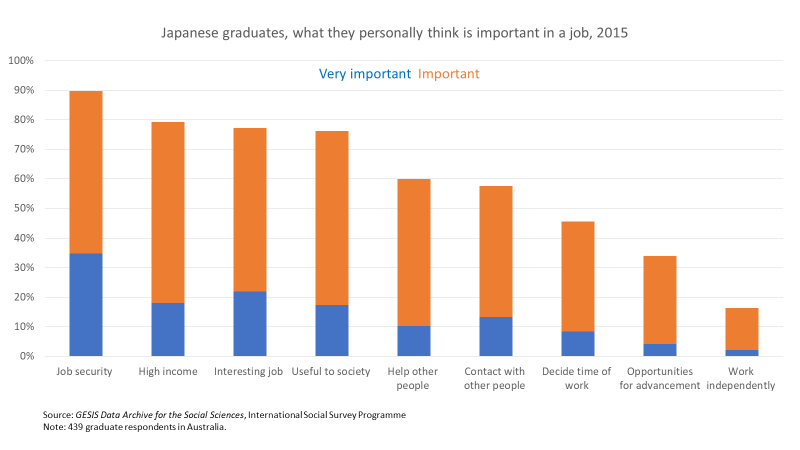 Perhaps with the idea of lifetime employment with a single firm having currency in Japan, in a way that it typically does not elsewhere, it is not too surprising that ‘job security’ is the highest-rated job criterion. Japanese graduates report low preferences for deciding their time of work, having opportunities for advancement and working independently – factors Australians graduates see as desirable in a job (ranging from 57% to 78% important) but in Japan are much less important than job security.