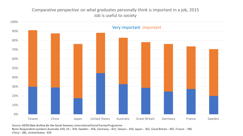 Australia ranks fourth of the nine countries on this metric, though for the share rating a job being useful to society as ‘very important’ it is second after the US.