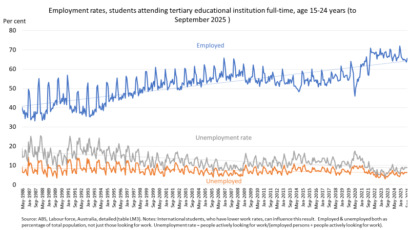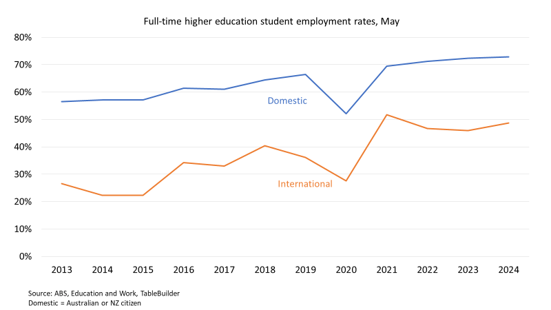 One complicating analytical factor in the 2010s is increasing international student onshore enrolments. Since 2013 the annual Education and Work survey has identified international students separately. Their lower work rates affect the overall trends. According to the chart below, 2013 and 2014 domestic employment rates were lower than subsequent years but rates for earlier years are unknown.