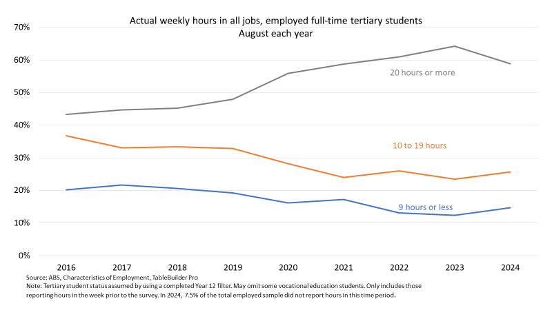 For students living out of home benefits exceeded median student paid work income in the late 2010s and again in 2024, although rent assistance probably wasn’t enough to cover rent costs. Escalating rent and other living costs may have made it increasingly difficult to survive on benefits, and so more students decided to work long hours rather than take income support.