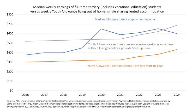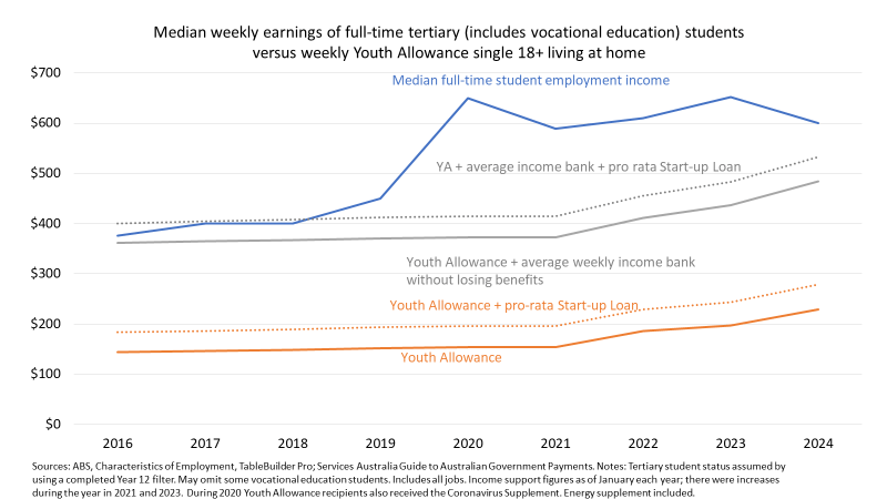 In the 2020s the median paid work income was significantly higher than the maximum income on benefits before Youth Allowance payments are reduced. At the cost of more hours at work, students would have a higher income and keep Centrelink bureaucracy out of their lives. However the premium delivered by median employment income over benefits has declined over time.