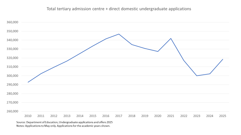 All age groups shown in the chart increased applications between 2024 and 2025, but growth was concentrated in the 24 years or under groups. This is consistent with counter-cyclical and structural factors holding down mature age demand, while demographic factors boost demand in the younger age groups.