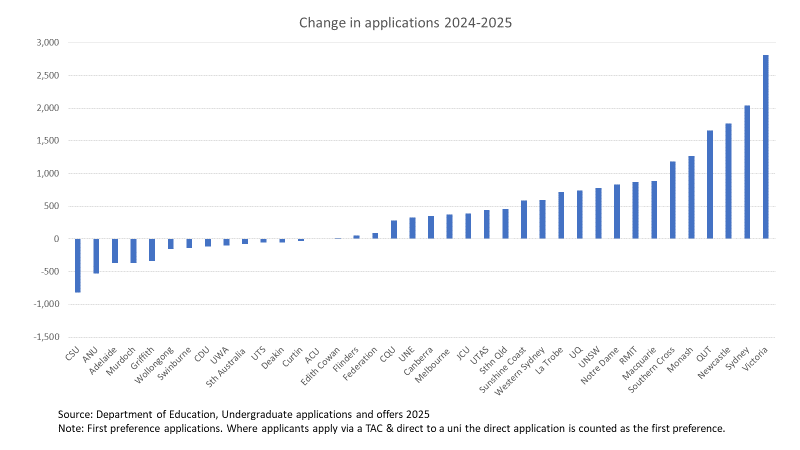 While aggregate applications are up, eight universities had fewer applications in 2025 than 2024. Other universities had major applications increases between these years, nine with double-digit percentage growth. The disconnect between these fluctuations and the proposed ‘managed growth’ enrolment system will be a policy problem of the coming years, presuming the required legislation passes (which of course I hope it doesn’t).