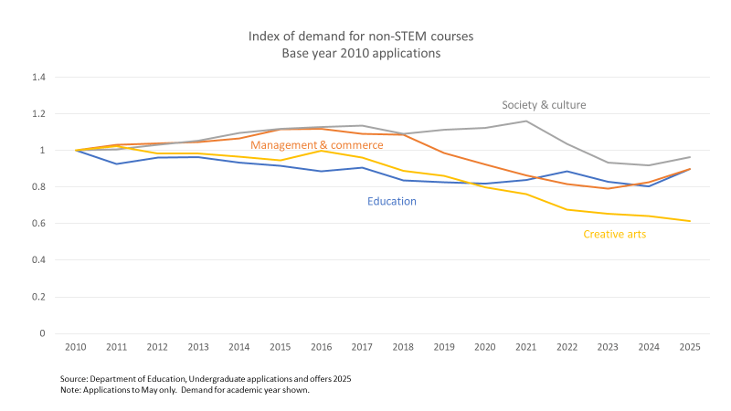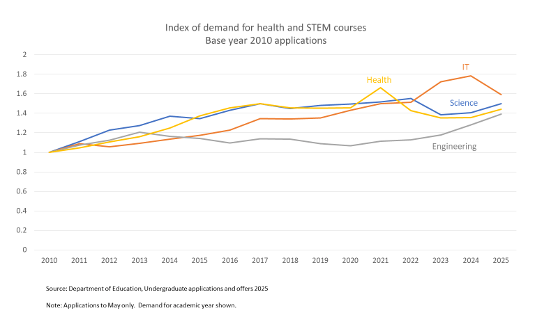 In 2025 IT came off its recent peak and several non-STEM fields enjoyed increased applications, but not enough to change the general conclusion about demand trends. All the non-STEM fields shown still had fewer applications in 2025 than in 2010.
