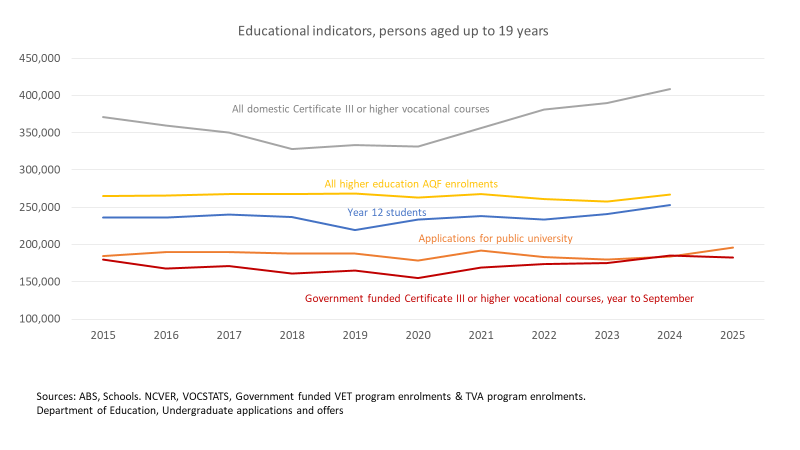 The chart below summarises data from multiple education sources to track the relevant youth education trends. The most striking trend is the strength of demand for vocational education post-COVID, although government-funded vocational courses up to September shows softening in 2025, while still being higher than any other year 2015 to 2023. Year 12 enrolments are trending up. Not all Year 12s are on an ATAR track, but Bretlyn Bailey collated data showing increases in ATAR recipients in 2023 and 2024. These are the people most likely to apply for the 2025 academic year, the applications data examined in this post.