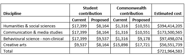 If the bill passed we would be left with JRG Commonwealth contributions and pre-JRG student contributions. Total funding for a full-time arts student would halve, from $18,715 to $9,480.