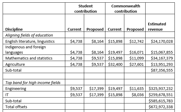The cost of these student contribution reductions would, on 2024 EFTSL, be around $720 million. More than 90% of that cost could be offset with the student contribution increases in the table below. Most of the work is done by lifting IT and engineering to the top student contribution band. The other changes make student contributions more consistent for students doing the same degree.
