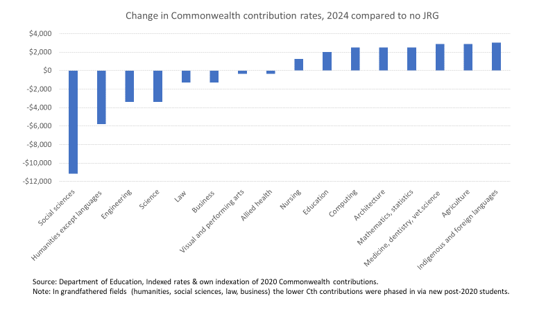 JRG also cut Commonwealth contributions in many fields, as seen in the chart below. This was part of a strategy to increase the number of student places at minimum cost to the Commonwealth, effectively requiring universities to deliver more places than previously to get their full grant amount. But when demand for those places wasn’t there these cuts to Commonwealth contributions also made it harder for universities to reach their allocated CGS amount.