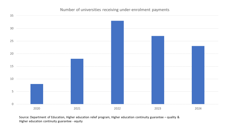 The number of universities receiving payments also fell, but remained at over half the sector in 2024. In that year three universities received less than $50,000 from the Guarantee, so with very slightly different EFTSL outcomes the number of recipients would have been lower.