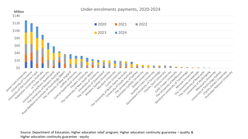 Last year I wrote about payments to universities under the Higher Education Continuity Guarantee, a Morrison-era program to compensate universities for ‘under-enrolment’. I then had data up to 2022. This can now be updated to 2024. Total expenditure on the Guarantee and its 2020 predecessor, the Higher Education Relief Program, now exceeds $1 billion.