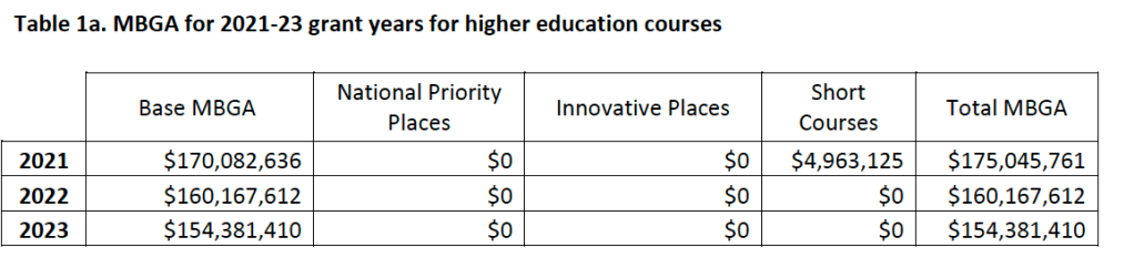 Education is not designated. It is funded under a block grant for ‘higher education courses’. Dollars rather than places are the unit of allocation and the entity that receives the allocation is a higher education institution, not a course or discipline. Recipient universities are free to distribute these dollars between courses according to their own priorities.