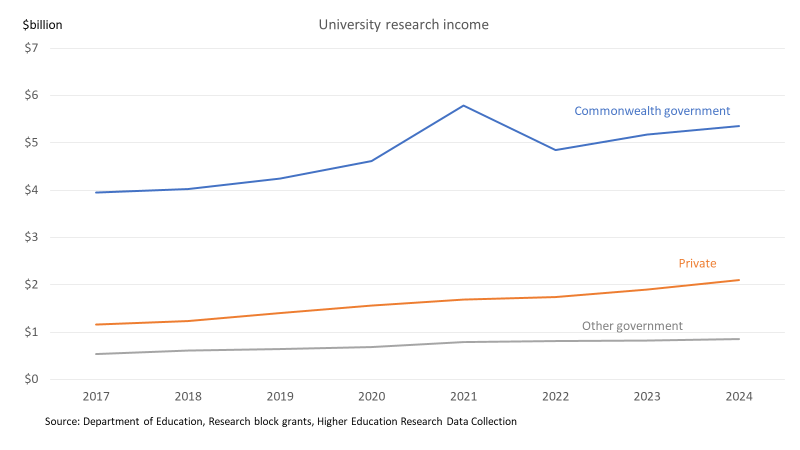 Research income has been the most recent significant data release, including research block grant funding for 2026 and the HERDC data used to calculate it, which goes up to 2024. The chart below shows the research-specific income sources 2017-2024.