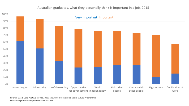 A job being interesting is the single-most desirable attribute of a job for Australian graduates. This is consistent with interests being the dominant factor in course choice.